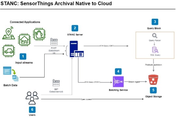 The OGC SensorThings API is an international standard that defines a comprehensive way to model, define and retrieve location enabled IoT sensor data. Although the standard serves as a unifying interface to interconnect and retrieve varying bulks of geospatial IoT data streams, it does not specify a way to store the ingested data. This serves as a great opportunity to use the standard for both analytical and operational use cases. The open-source implementations of the standard have mostly used relational database technologies that are best suited for operational use cases at small-medium volumes of data. It is well acknowledged that while RDBMS systems may be an excellent choice for managing small-medium scale geospatial relational data, they’re not the best solution when dealing with data at scale for analytical purposes. There is a need for an alternative storage layer for OGC SensorThings API. Hence, we present STANC (SensorThings Archival: Native to Cloud) which is a novel, cloud-native, spatial data lakehouse, based on OGC SensorThings API and Apache Iceberg.