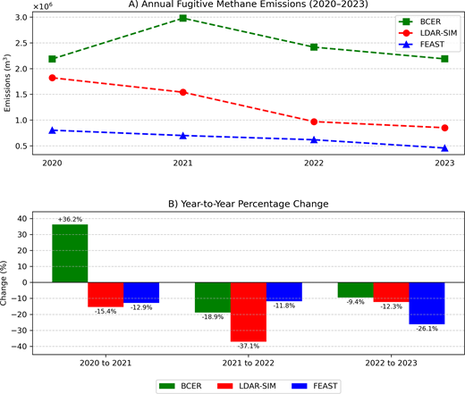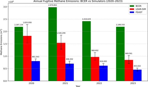 A comparative study of FEAST and LDAR-Sim using BCER regulatory data (2020–2023) to evaluate how well open-source LDAR simulators reproduce real-world methane emissions.